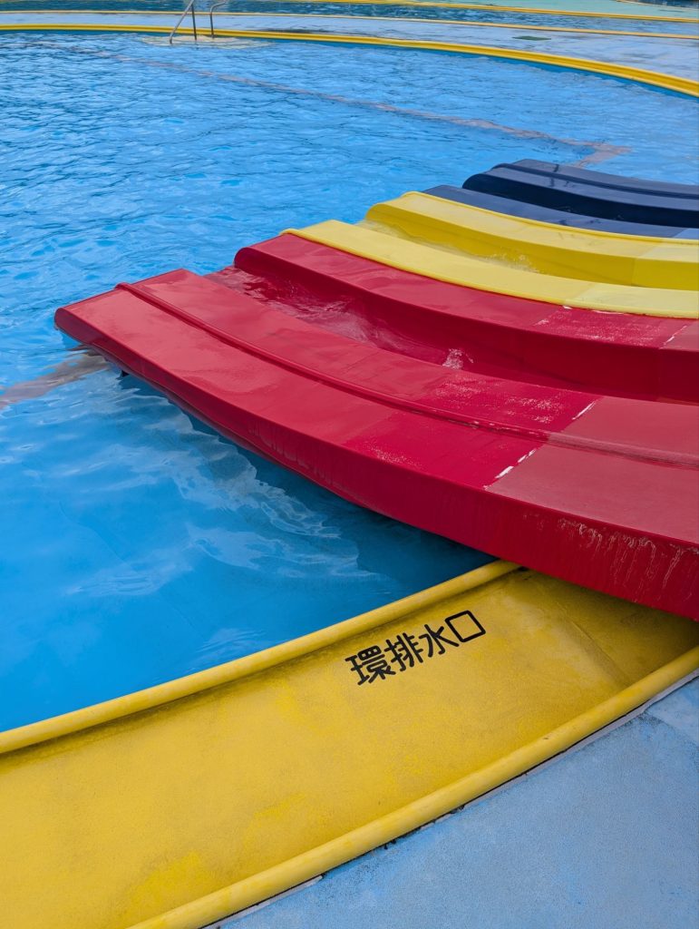 丸い着水プールは対岸15mありますが、今日みたいな特に水多めな日は、赤い線の四角の枠内の端まで来れば十分です。プールサイドに上がる階段(滑る側の視点から見て左)くらいを目標にすれば良いと思います。