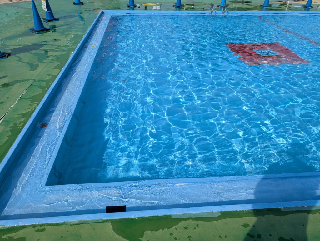 近年は着水プールの底に殴打するケガの防止らしく、放水しっぱなし高水位をキープ。